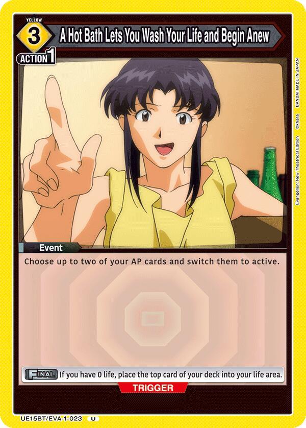 El precio de referencia de A Hot Bath Lets You Wash Your Life and Begin Anew - UE15BT: Evangelion: New Theatrical Edition (UE15BT) - Evangelion New (UE15BT) es $114 CLP según TCGplayer. En CardIndex aún no hay vendedores en Chile para esta carta. Los precios pueden variar según la condición de la carta, idioma o disponibilidad del vendedor.